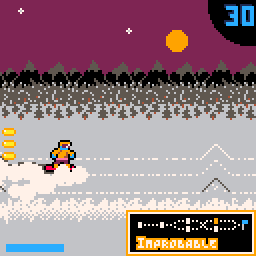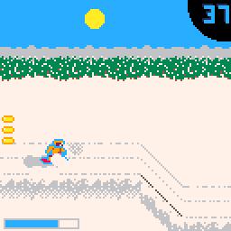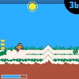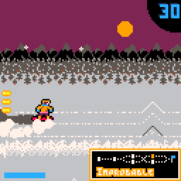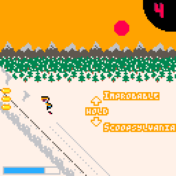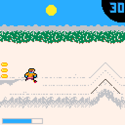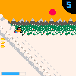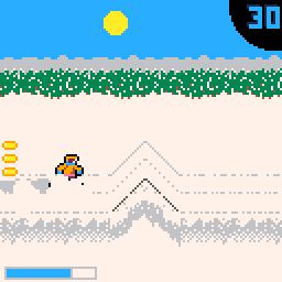 For every two successful jumps that you land, you'll get a unit of boost (up to a max of three boosts). Press Pico-8's X button (or X/V keys on the keyboard) to use one of your boosts, which will increase your maximum speed for a short period of time. You'll travel higher and farther if you hit a ramp while boosting.